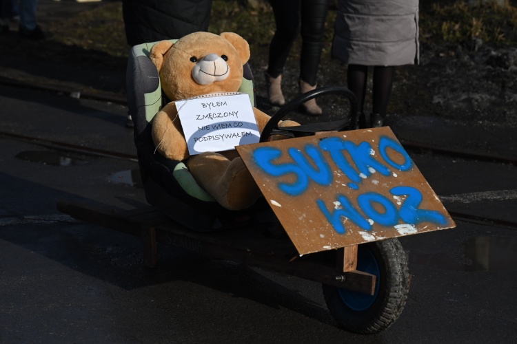 Pracownicy PG Silesia w nawiązaniu do tej sytuacji przynieśli na pikietę taczkę z misiem symbolizującego pracodawcę.