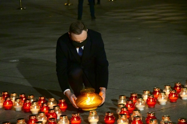 Prezydent Andrzej Duda wraz z prezesem IPN Jarosławem Szarkiem stawia znicz przy Krzyżu Papieskim na Placu Piłsudskiego w Warszawie w rocznicę ogłoszenia przez gen. Jaruzelskiego stanu wojennego 13 XII 1981 roku.