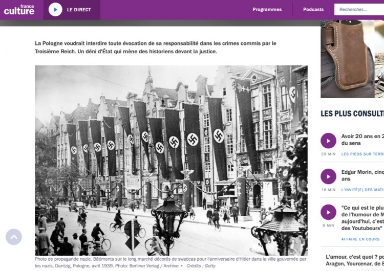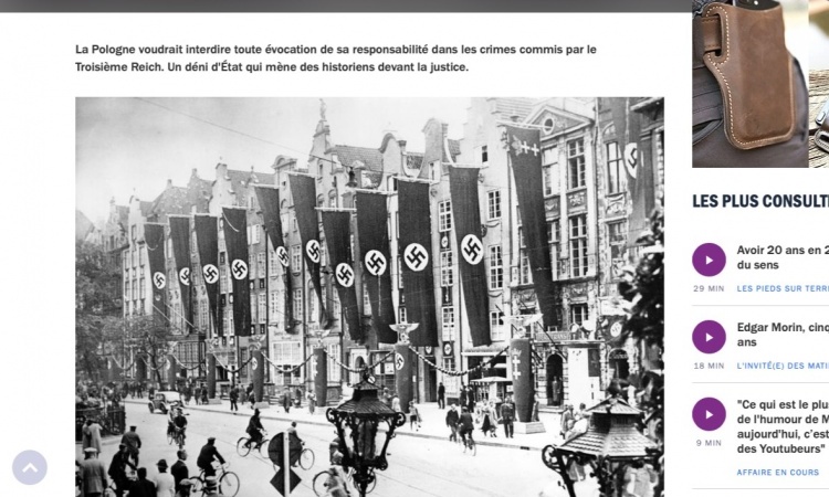 Artykuł dotyczy rzekomej "odpowiedzialności Polski za zbrodnie III Rzeszy". Wraz z nim zamieszczono zdjęcie z przedwojennego Gdańska przedstawiające flagi Rzeszy Niemieckiej powiewające wzdłuż Długiego Targu. Pod spodem umieszczono podpis "Gdańsk, Polska, kwiecień 1939 r.", mimo że Gdańsk nie należał wtedy do Polski.