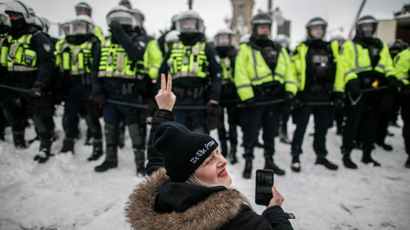 Trudeau po bolszewicku idzie na całość, jego dekret o stanie wyjątkowym musi zatwierdzić parlament, którego obrady odroczono (ze względu na bezpieczeństwo) na poniedziałek. W Ottawie, w rejonie protestu policja organizuje strefy zgniotu, uzbrojeni po zęby policjanci spychają sympatyków protestujących kierowców ciężarówek. Facet ma pecha, bo protestujący ludzie są naprawdę pokojowi, nie ma podpaleń, pobić, walk, kradzieży, dewastacji (tak to było w US latem 2020 r.). Ten protest bardziej przypomina protest Gandhiego, czy polskiej Solidarności, niż ukraiński majdan, czy w US demolujące protesty BLM i Antify. Okazuje się, że najbardziej niebezpiecznym zawołanie w Kanadzie jest: “Trzymaj kurs!"