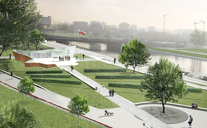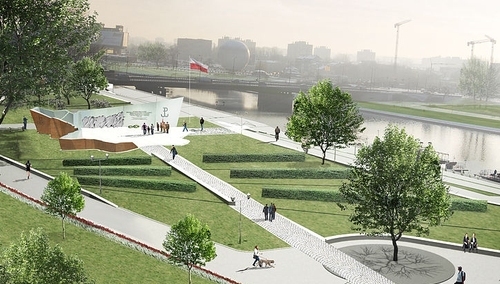 "W międzynarodowym konkursie na projekt pomnika zwyciężył zespół Aleksandra Smagi. Monument ma mieć kształt wstęgi, która wyłania się spod ziemi. Będzie zbudowany z dwóch stalowych warstw: zewnętrznej w kolorze rdzy i wewnętrznej w kolorze błyszczącej stali. Forma wstęgi odzwierciedla granice Rzeczpospolitej Polskiej w momencie wybuchu II wojny światowej. Wstęga wyznaczy granice niewielkiego placu - miejsca zebrań, manifestacji i składania hołdu podczas uroczystości patriotycznych. Lokalizacja pomnika pod Wawelem od kilkunastu miesięcy budzi kontrowersje" - napisała Polska Agencja Prasowa.