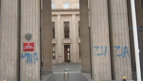 - Dziś w nocy grupa zamaskowanych osób dokonała aktu wandalizmu na budynku, który zajmuje szczególne miejsce w naszej historii. Barbarzyńcy, idioci, zrobili to z pełną premedytacją, to była zaplanowana akcja - powiedział na specjalnej konferencji szef resortu edukacji Dariusz Piontkowski. Jak dodał, na terenie ministerstwa znajduje się monitoring oraz ochrona.