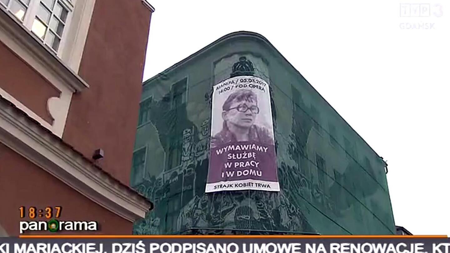 Plakat z wizerunkiem Anny Walentynowicz opisany jest hasłem "Wymawiamy służbę w pracy i w domu" a poniżej - Strajk kobiet trwa, zawisł na jednym z budynków Poznania. Są też informacje gdzie i kiedy odbędzie się w tym mieście manifa.