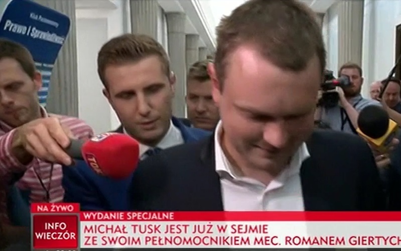 Synowi premiera towarzyszył mecenas Roman Giertych, który miał go strzec przed szczególnie dokuczliwymi pytaniami posłów, które mogły pogrążyć świadka, ale ostatecznie w pełni mu się to nie udało.