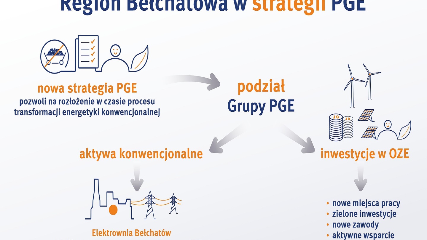 Region Bełchatowa ma się zmienić. W PGE został powołany projekt transformacji regionu Bełchatowa (uchwała Zarządu PGE S.A. o powołaniu Projektu "Sprawiedliwej transformacji Kompleksu Bełchatów"). W ramach projektu PGE zainwestuje w elektrownie słoneczne, farmy wiatrowe, instalacje termicznego przekształcania odpadów oraz magazyny energii. Koncern liczy, że pozyska fundusze na inwestycje w okolicach Bełchatowa od Komisji Europejskiej, która uznała Bełchatów za region górniczy wymagający wsparcia z funduszy unijnych w procesie transformacji. Wydzielona z Grupy Elektrownia i Kopalnia w Bełchatowie ma ściśle współpracować z PGE.