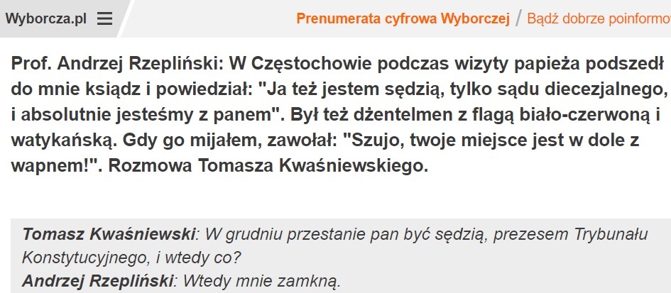 - Wtedy mnie zamkną - odpowiada na pytanie dziennikarza Wyborczej o to co się stanie kiedy przestanie być prezesem Trybunału Konstytucyjnego prezes TK Andrzej Rzepliński, co jest doskonałą ilustracją stanu psychicznego tzw. "elit"