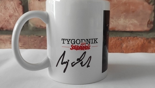 Kubek został podpisany przez Pana Prezydenta przy okazji gali nagrody Człowieka Roku "Tygodnika Solidarność". To przedmiot unikatowy - Pan Prezydent podpisał zaledwie trzy takie kubki. Znajdują się na nim loga "Tygodnika Solidarność" i portalu Tysol.pl oraz grafika - "Sztafeta pokoleń" na widzimy powstańca styczniowego, oficera wojny polsko-bolszewickiej, żołnierza wyklętego, powstańca warszawskiego, robotnika poznańskiego czerwca 1956 i robotnika sierpnia 1980 trzymającego sztandar "Solidarności".