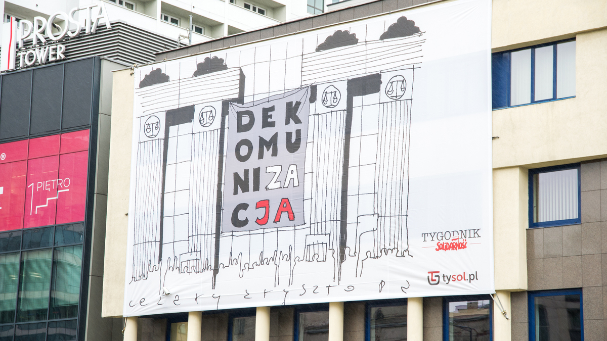 "Tygodnik Solidarność" postanowił odpowiedzieć na napis "Konstytucja" na siedzibie Sądu Najwyższego. Dlatego dzisiaj zaprezentowaliśmy kilkudziesięciometrowy baner z rysunkiem "Dekomunizacja" autorstwa Cezarego Krysztopy, który pojawił się na siedzibie naszej redakcji.