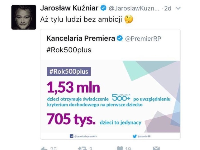 1 kwietnia rządowy program "Rodzina 500 plus" obchodził pierwsze urodziny. Program, który poprawił jakoś życia wielu polskich dzieci i rodzin, stał się obiektem szyderstw byłego dziennikarza TVN Jarosława Kuźniara. Na swoim Twitterze napisał: "Aż tylu ludzi bez ambicji".