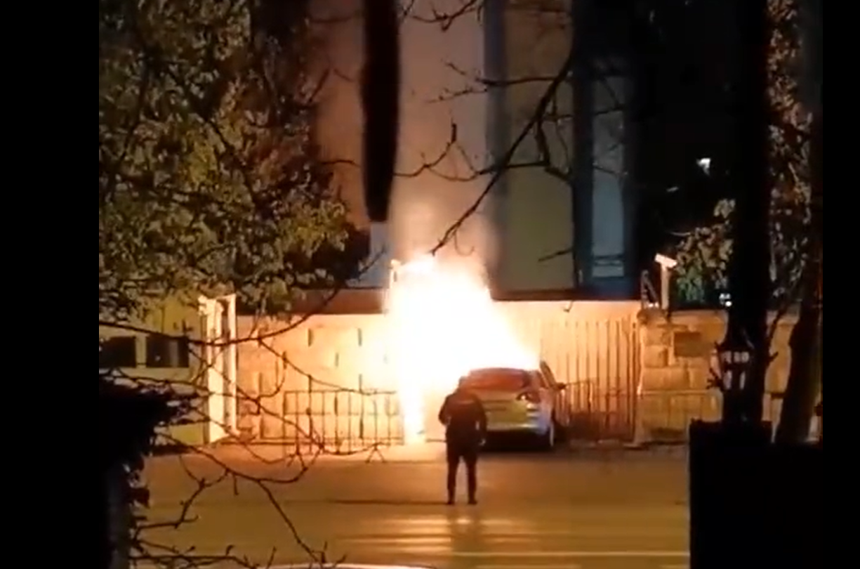 A car crashed into the #Russian Embassy building in #Bucharest, #Romania; after the collision the car caught fire. According to local media, the driver died. pic.twitter.com/Ttwud49eqU