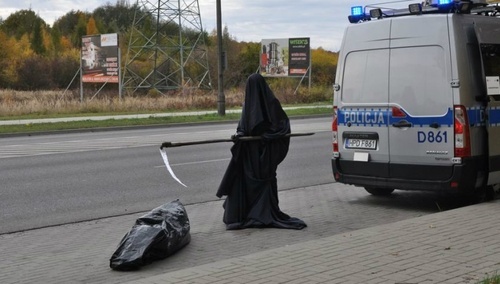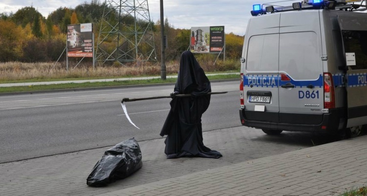 Przy drodze stała uzbrojona w kosę śmierć, pochylona nad czarnym workiem. - Kierowcy wyjeżdżający z Chełma w kierunku Lublina mieli okazję zobaczyć obraz sugerujący zdarzenie drogowe, którego skutkiem była śmierć człowieka - pisze na swojej stronie chełmska policja.