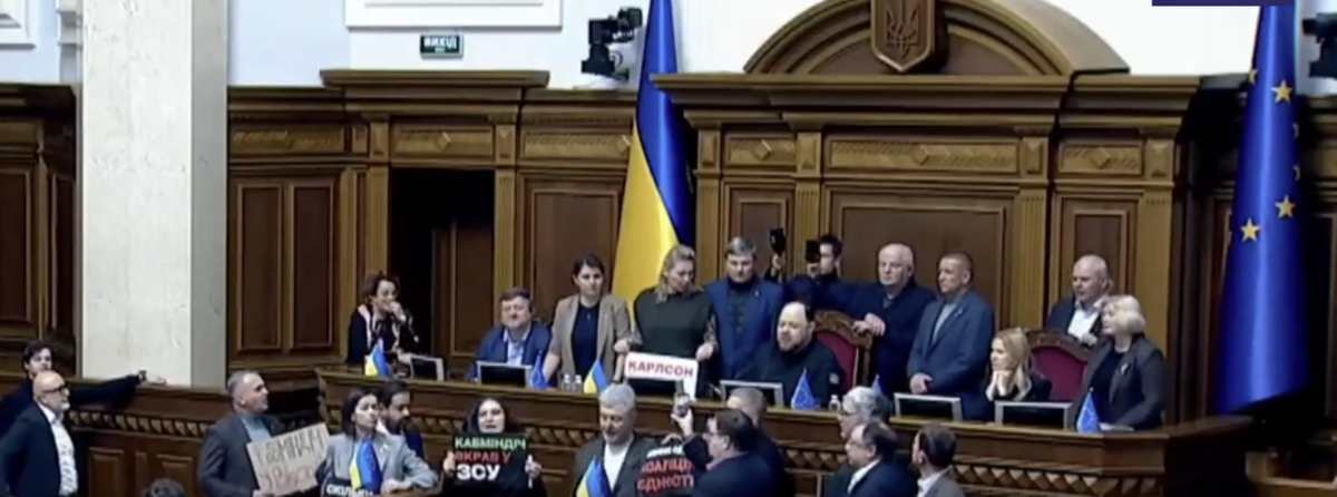 W trakcie obrad na mównicy pojawił się były prezydent Ukrainy Petro Poroszenko wraz z grupą deputowanych "Europejskiej Solidarności". Posłowie trzymali transparenty z wezwaniami do dymisji całego gabinetu.
