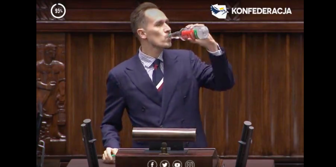 Debata o podwyżce akcyzy na alkohol. Poseł Konfederacji pił na mównicy sejmowej? [WIDEO]