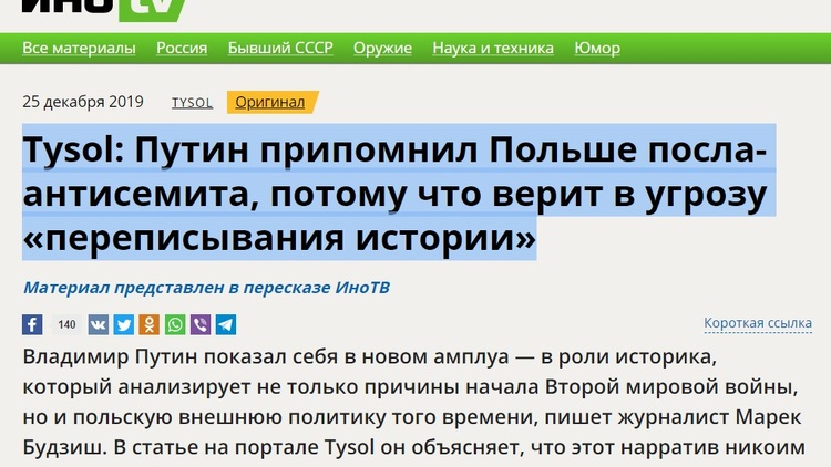 - Nagromadzenie dyplomatycznych porażek i niepowodzeń z jakimi mierzyć się musiał rosyjski prezydent w ostatnich dniach mogłyby skłaniać nas do poglądu, że w gruncie rzeczy jego historyczne wystąpienia ostatnich dni miały charakter odreagowania, spontanicznej i emocjonalnej wypowiedzi, swego rodzaju wybuchu. Ale nic bardziej błędnego. Mamy, jak można przypuszczać, do czynienia z początkiem rosyjskiej ofensywy historycznej, w której moskiewska narracja na temat tego co się działo w przeszłości służy dzisiejszym interesom Federacji Rosyjskiej. Już sam moment i miejsce wystąpienia Putina winno nas skłaniać do takiego wniosku. Rosyjski prezydent zdecydował się na wygłoszenie historycznego referatu, w którym przywoływał odszukane w archiwach dokumenty dyplomatyczne, co świadczy, że sama akcja była od pewnego już czasu przygotowywana - pisał u nas Marek Budzisz w artykule "Putin – "historyk" II Rzeczpospolitej i roli Polski w dziejach". Artykuł został obszernie przetłumaczony w rosyjskim portalu ИноТВ zajmującym się doniesieniami zagranicznych mediów, będącym częścią grupy RT, czyli dawnego Russia Today