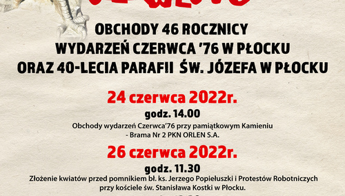 Andrzej Kropiwnicki - Przewodniczący NSZZ "Solidarność" Region Mazowsze oraz Andrzej Kierzkowski - Przewodniczący Organizacji Terenowej Nr 1 Ursus NSZZ "Solidarność" zapraszają na uroczyste obchody 43 rocznicy Wydarzeń Czerwca’76 w Ursusie, które odbędą się 30 czerwca 2019 roku w Ursusie.
