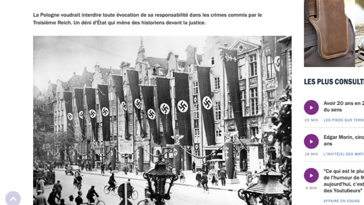 Francuskie radio publiczne ilustruje materiał o "odpowiedzialności Polski za zbrodnie III Rzeszy" zdjęciem przedstawiającym powiewające flagi ze swastykami. Pod nim podpis: "Gdańsk, Polska, kwiecień 1939 r.".