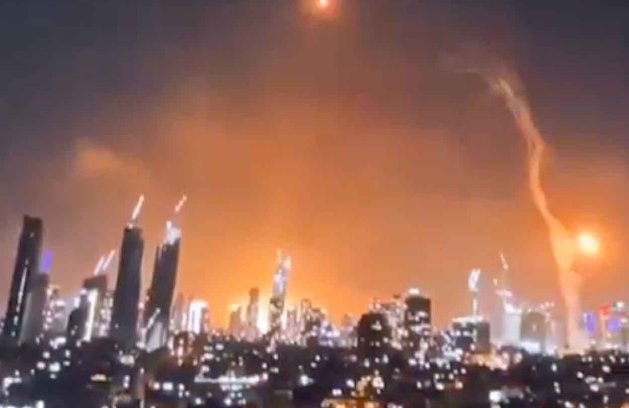 Agencja AFP poinformowała, że w stronę Izraela lecą dziesiątki rakiet, a w Jerozolimie słychać było syreny alarmowe oraz eksplozje. W sieci pojawiły się zdjęcia ukazujące kłęby dymu nad Tel Awiwem. Na nagraniach udostępnionych w sieci widać, że przynajmniej jedna rakieta balistyczna przebiła się przez izraelską "żelazną kopułę".
