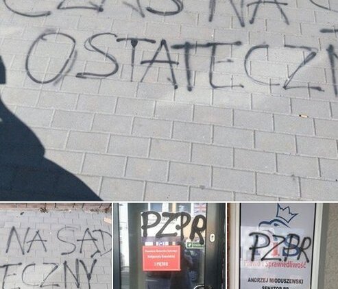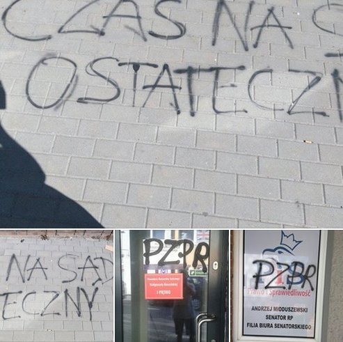 Przed wejściem do wspólnej filii biura pojawiły się napisy - "Czas na sąd ostateczny". Na drzwiach i oknach napisano - "PZPR". Dewastacja odbyła się w nocy z piątku na sobotę.