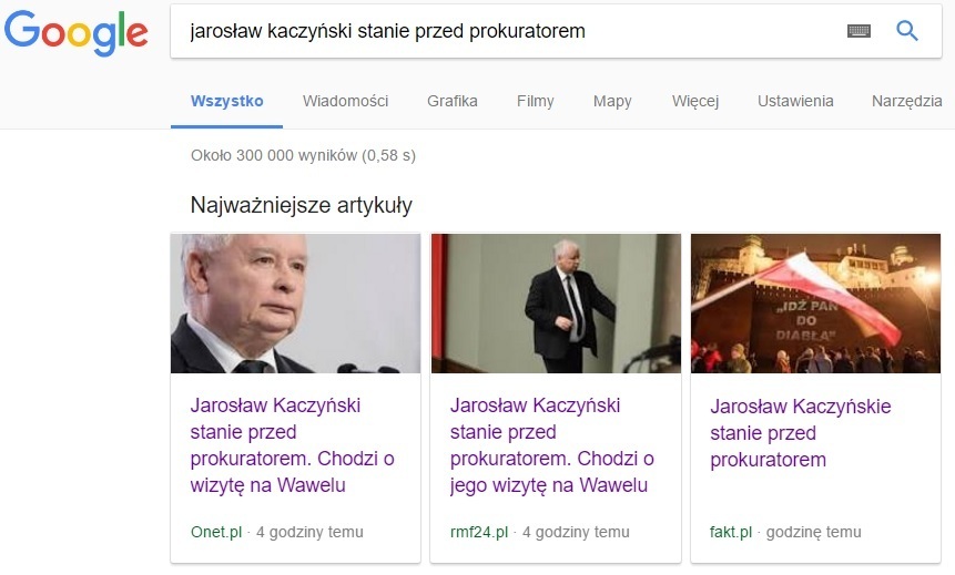 "Jarosław Kaczyński stanie przed prokuratorem. Chodzi o wizytę na Wawelu" - pisze Onet, "Jarosław Kaczyński stanie przed prokuratorem. Chodzi o jego wizytę na Wawelu" - pisze rmf24.pl, "Jarosław Kaczyński stanie przed prokuratorem. Chodzi o Wawel" - pisze Fakt.pl, "RMF: Jarosław Kaczyński stanie przed prokuratorem. Chodzi o jego wizytę na Wawelu" - pisze Interia. Ktoś mógłby pomyśleć, że chodzi o to, że ma zostać oskarżony. Tymczasem chodzi o to, że ma się stawić w prokuraturze w charakterze ŚWIADKA a badane ma być to czy został znieważony. Pikanterii sprawie dodaje fakt, że wyżej wymienione media używające tak zadziwiająco zbieżnych tytułów są mediami niemieckich właścicieli.