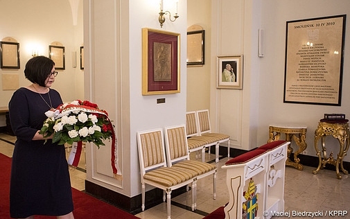 W Kaplicy Pałacu Prezydenckiego Małgorzata Sadurska, Szef Kancelarii Prezydenta RP złożyła w środę kwiaty przed tablicą upamiętniającą Parę Prezydencką Lecha i Marię Kaczyńskich, ostatniego Prezydenta RP na uchodźstwie Ryszarda Kaczorowskiego oraz pracowników Kancelarii Prezydenta RP, którzy zginęli w katastrofie smoleńskiej 10 kwietnia 2010 roku.