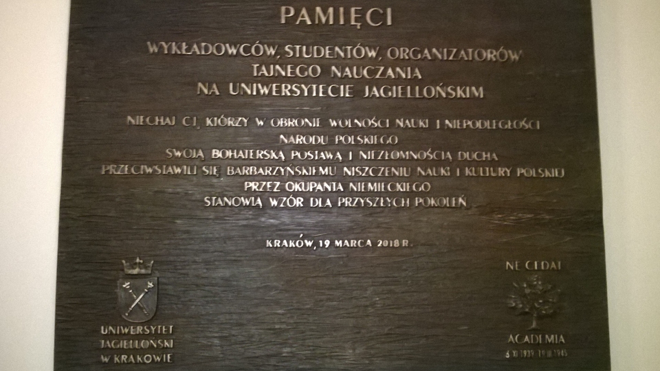 W 73. rocznicę pierwszej po II wojnie światowej inauguracji nowego roku akademickiego na Uniwersytecie Jagiellońskim w Collegium Novum uczelni odsłonięto tablicę upamiętniającą tajne nauczanie w stolicy niemieckiego Generalnego Gubernatorstwa.