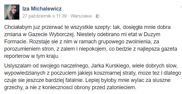 - Chciałabym już przerwać te wszystkie szepty: tak, dosięgła mnie dobra zmiana w Gazecie Wyborczej. Niestety odebrano mi etat w Dużym Formacie. Rozstaje się z nim w ramach grupowego zwolnienia, za porozumieniem stron, z żalem i niepokojem, co będzie z najlepszą gazetą reporterów w tym kraju. - pisze na swoim profilu FB była już dziennikarka reporterskiego dodatku do Gazety Wyborczej "Duży Format" Iza Michalewicz