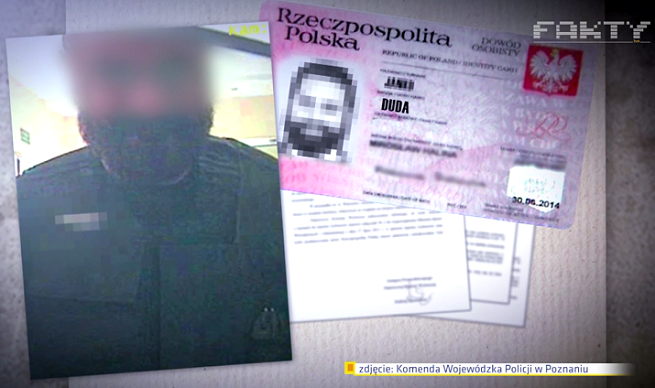 W materiale "Faktów" pokazano m.in. zdjęcie z listu gończego wydanego na Krzysztofem W. oraz grafikę komputerową (patrz powyżej) pokazującą dowód z nazwiskiem Duda, którym posługiwał się oszust. W grafice zdjęcie i imię na dowodzie zostały zamazane, a imię wygląda na krótsze niż Mirosław i zaczynające się od J.