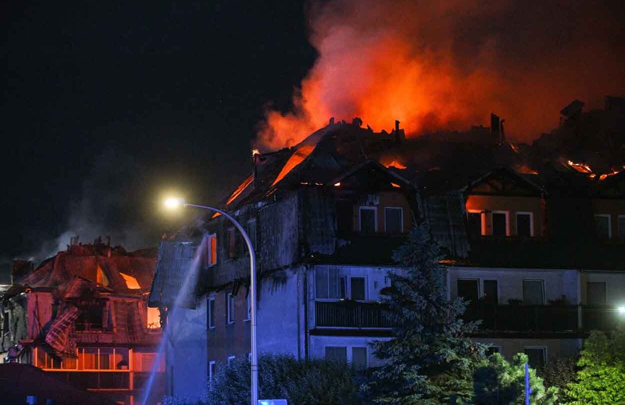 Pożar wybuchł w czwartek, 3 lipca 2025 r., około godz. 19 na poddaszu jednego z bloków na osiedlu przy ul. Powstańców w Ząbkach. Ogień szybko objął dwie najwyższe kondygnacje z mieszkaniami dwupoziomowymi.