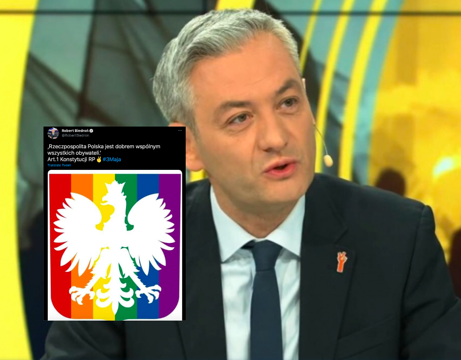 "Profanacja". Biedroń prowokuje i publikuje godło Polski na tęczowym tle. Internauci wściekli