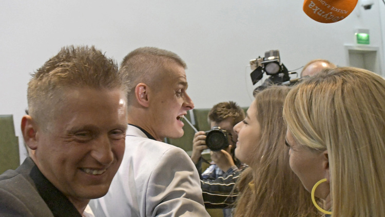 Po 18 latach pobytu w więzieniu Tomasz Komeda decyzją Sądu Najwyższego został uniewinniony a wyrok został uchylony. Na sprawę przybyła rodzice i liczna rodzina. Zdjęcie artykułu -.radość po ogłoszeniu wyroku przez Sąd Najwyższy.