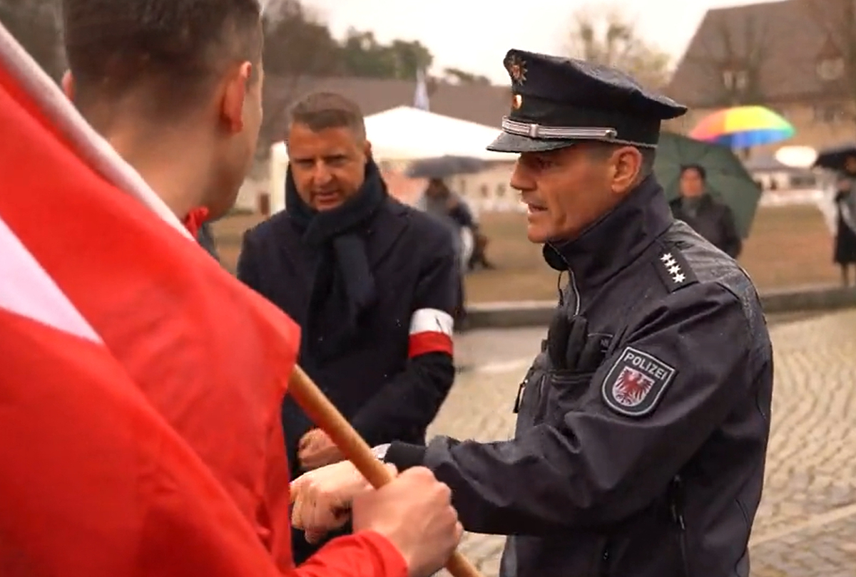 Przed niemieckim obozem koncentracyjnym w Ravensbrück, niemiecki policjant zwraca się niczym kapo do Polaków z @nsz_1942, którzy przyjechali oddać hołd zamordowanym przez Niemców Polkom. Ambasador Niemiec pilnie powinien zostać wezwany na dywanik do MSZ. pic.twitter.com/8L1U8gTgXh
