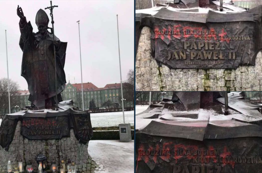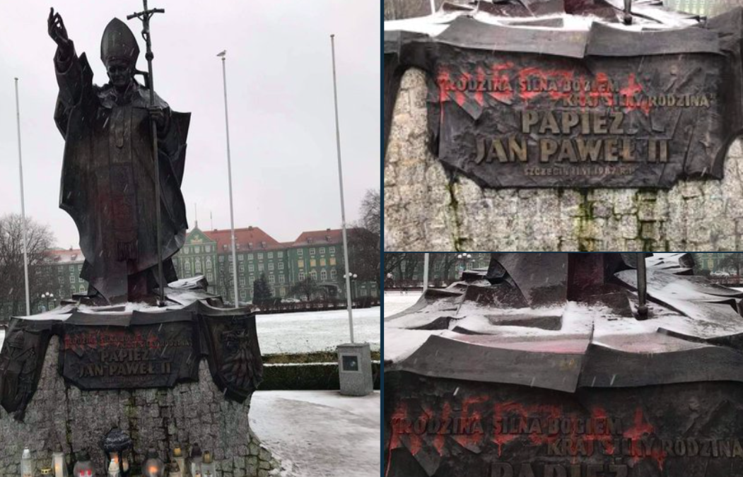Dziś w Szczecinie zdewastowano Pomnik Św. Jana Pawła II. Symboliczne, że zamazano napis: "Rodzina silna Bogiem, kraj silny rodziną". pic.twitter.com/YiICFjLhRS