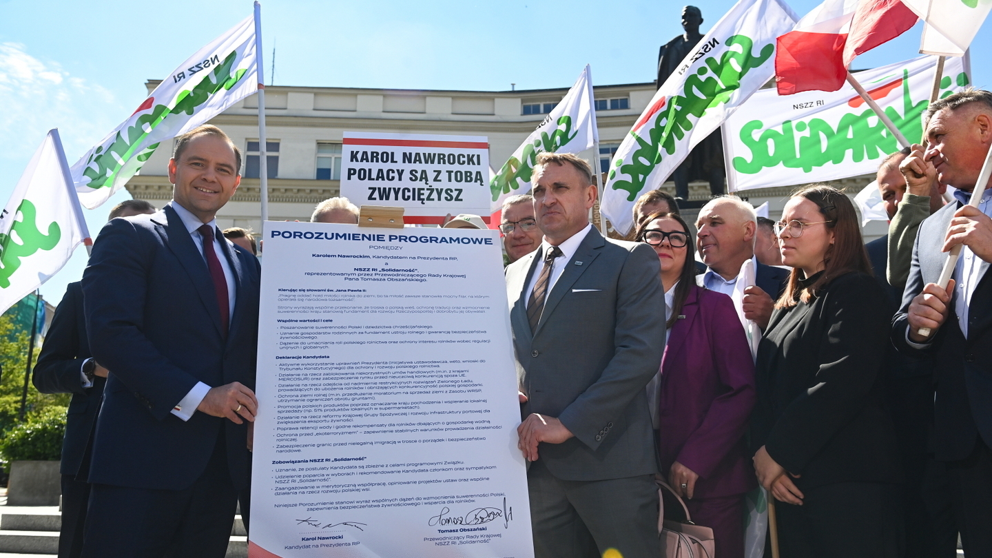 NSZZ Rolników Indywidualnych patrząc na to, co się dzisiaj dzieje w Polsce, jakie są zagrożenia dla rolnictwa i co niesie za sobą Solidarność przez te ponad 40 lat, co ma na sztandarach: Bóg, Honor, Ojczyzna, powiem, że dzisiaj popieramy Karola Nawrockiego jako kandydata na prezydenta