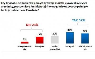 Pomysł ustawy o jawności życia publicznego, który zakłada, że oświadczenia majątkowe będą składać nie tylko osoby na eksponowanych stanowiskach publicznych np. posłowie, sędziowie, ale także zwykli urzędnicy państwowi (np. członkowie komisji przetargowych, egzaminatorzy na prawo jazdy, pracownicy sekretariatu sądu czy pracownicy administracyjni policji) popiera 57% dorosłych Polaków, w tym stosunkowo najliczniej elektoraty PiS (62%) i Platformy Obywatelskiej (66%). Pomysł cieszy się najmniejszym poparciem wśród sympatyków Nowoczesnej (37%) i Kukiz’15 (43%).