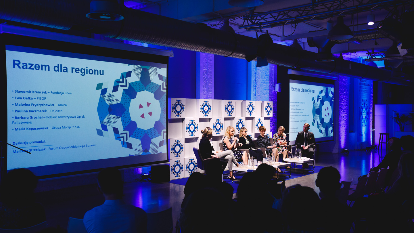 Konferencję rozpoczęła debata "Razem dla regionu" moderowana przez Marzenę Strzelczak z Forum Odpowiedzialnego Biznesu. Wzięli w niej udział: Sławomir Krenczyk - prezes Fundacji Enea, Ewa Gałka ze Stowarzyszenia PISOP, Malwina Frydrychowicz - menedżer ds. komunikacji i CSR w firmie Amica, Paulina Kaczmarek - sustainability consulting manager w firmie Deloitte, Barbara Grochal z Polskiego Towarzystwa Opieki Paliatywnej i Maria Kopaszewska - Pośrednik Dobra, specjalistka ds. CSR Grupa Mo Sp. z o.o.