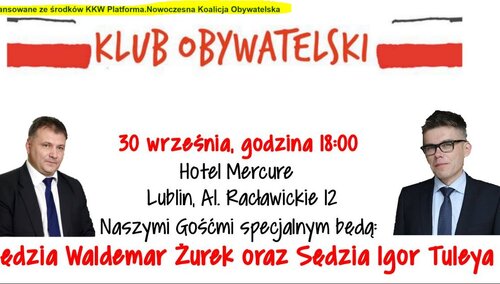 Na 30 września w Lublinie zapowiada tzw. Klub Obywatelski oficjalnie podający się za partnera Platformy Obywatelskiej i jej think-tanku Instytutu Obywatelskiego spotkanie z sędziami Żurkiem i Tuleyą. Na zaproszeniu widnieje adnotacja: Sfinansowane ze środków KKW Platforma .Nowoczesna Koalicja Obywatelska. Jak to się ma do zapisanego w konstytucji wymogu apolityczności sędziów?