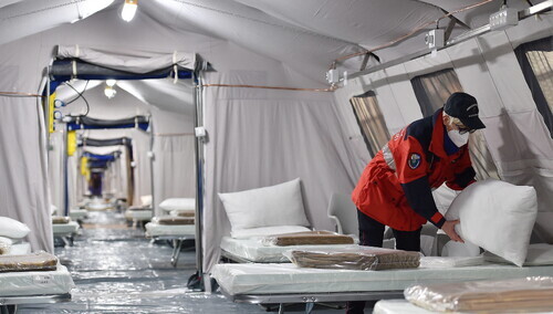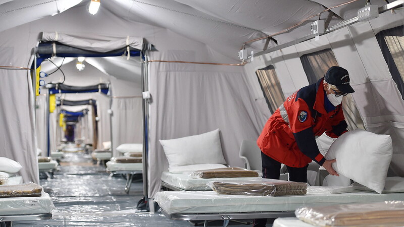"W szpitalu tymczasowym jest ordynator i zespół dyżurny, który się zmienia co 3 godziny (dłuższa praca w kombinezonach i maskach jest niemożliwa). W ciągu 24 godzin jest 8 zmian zespołów. W zakresie objawów COVID-19 szpital jest przygotowany na leczenie większości zakażonych SARS-COV-2" - zapewnił.
