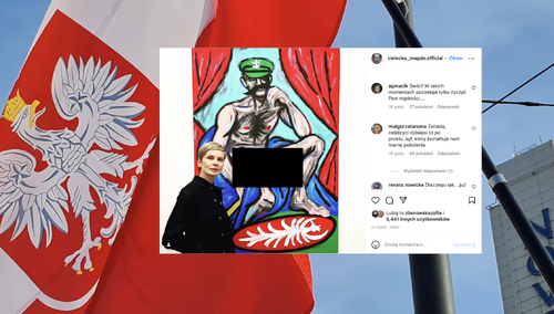 Na fotografii widzimy pozującą przy obrazie Cielecką - a sam obraz przedstawia roznegliżowanego marszałka Józefa Piłsudskiego.