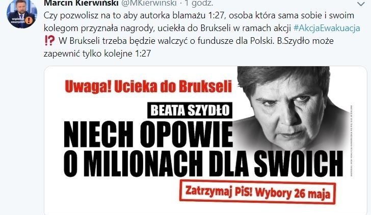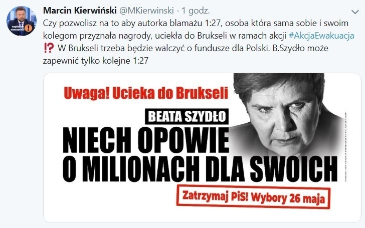 Czy pozwolisz na to aby autorka blamażu 1:27, osoba która sama sobie i swoim kolegom przyznała nagrody, uciekła do Brukseli w ramach akcji #AkcjaEwakuacja ⁉️ W Brukseli trzeba będzie walczyć o fundusze dla Polski. B.Szydło może zapewnić tylko kolejne 1:27 pic.twitter.com/8hibAxcqHO