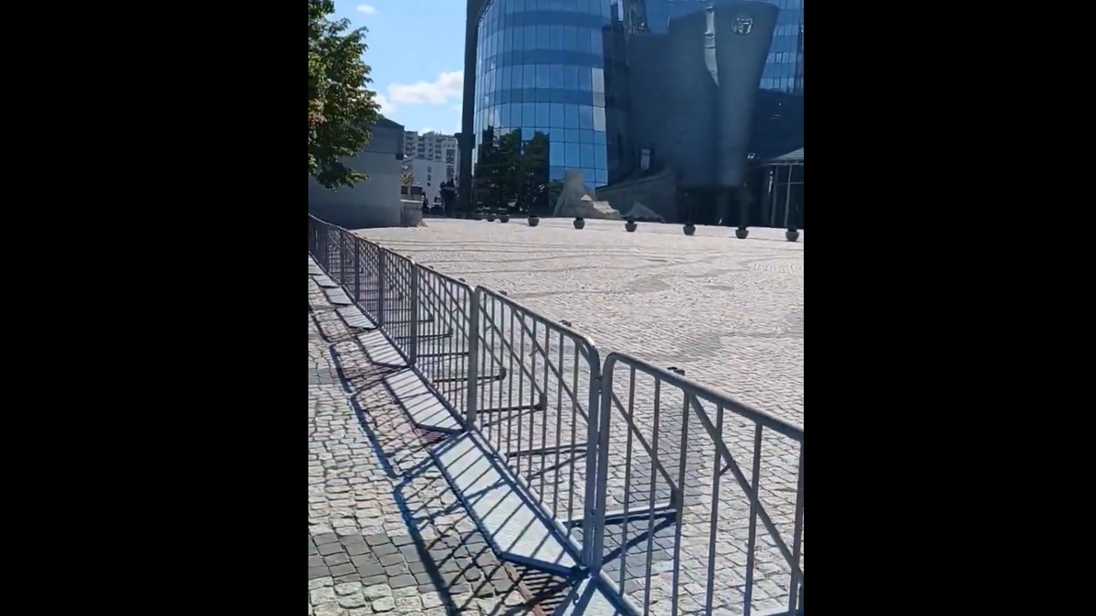 Jesteśmy przed nielegalną TVP w likwidacji na Woronicza 17. Tutaj panowie przywieźli bardzo mocne barierki. Dla uzupełnienia informacji. Przed chwilą były tutaj inne barierki, ale były one znacznie lżejsze. Te [aktualne - red.] są wzmocnione blachą i podporami, aby nie można było ich przewrócić, bo władze spodziewają się przyjścia znacznej grupy osób