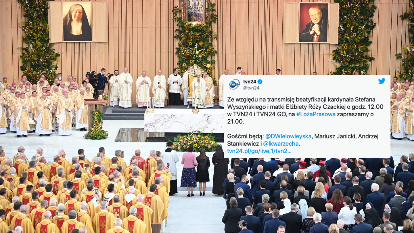 "Ze względu na transmisję beatyfikacji kardynała Stefana Wyszyńskiego i matki Elżbiety Róży Czackiej o godz. 12.00 w TVN24 i TVN24 GO, na #LożaPrasowa zapraszamy o 21.00" - poinformowała dziś w mediach społecznościowych stacja TVN24.