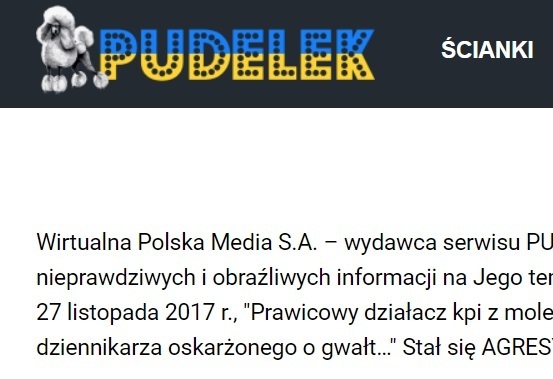 - Wirtualna Polska Media S.A. - wydawca serwisu PUDELEK przeprasza Pana Jakuba Dymka za naruszenie jego dóbr osobistych poprzez zamieszczenie nieprawdziwych i obraźliwych informacji na Jego temat w artykułach pt. "Dwóch lewicowych dziennikarzy oskarżonych o GWAŁT i MOLESTOWANIE!" - z dnia 27 listopada 2017 r., "Prawicowy działacz kpi z molestowania feministki…" - z dnia 27 listopada 2017 r. oraz "TYLKO U NAS: Szkolna koleżanka wspomina dziennikarza oskarżonego o gwałt…" Stał się AGRESYWNY, ZNĘCAŁ SIĘ NADE MNĄ" - z dnia 28 listopada 2019 r.