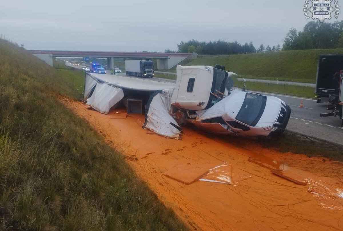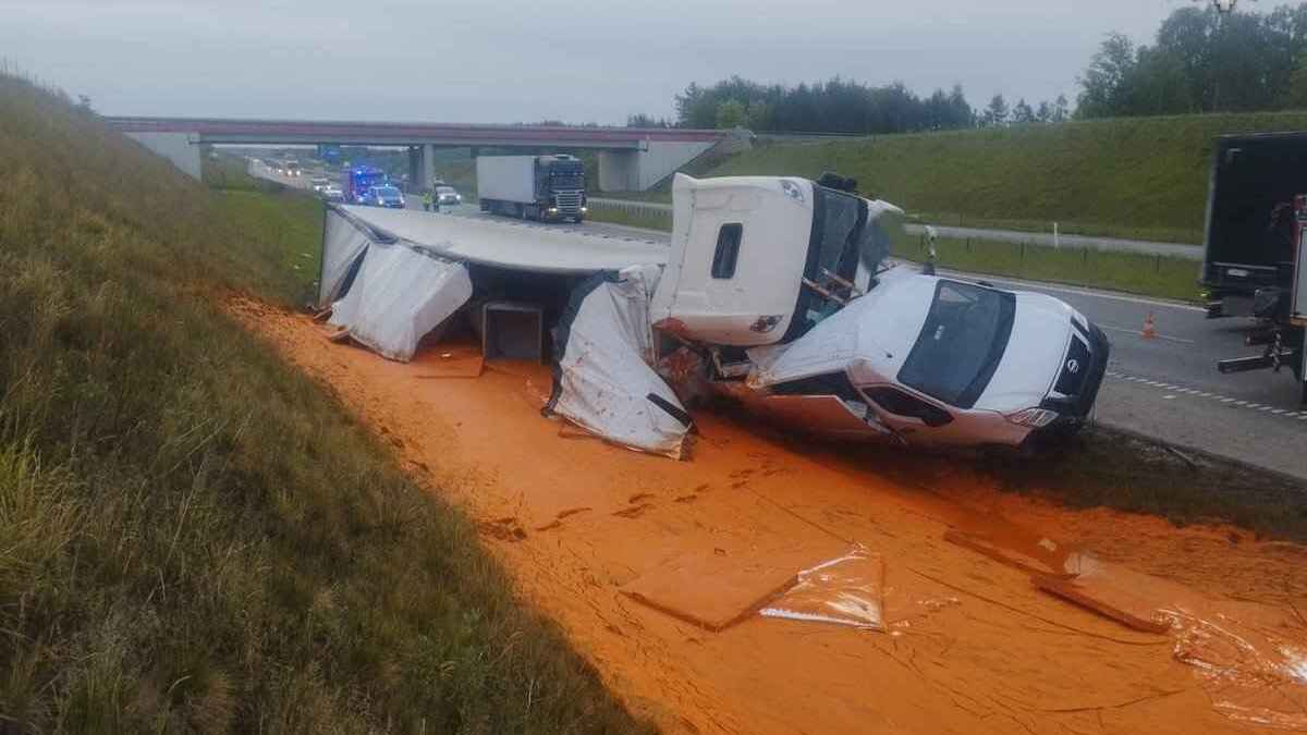 Wypadek na A1. Autostrada w soku pomidorowym