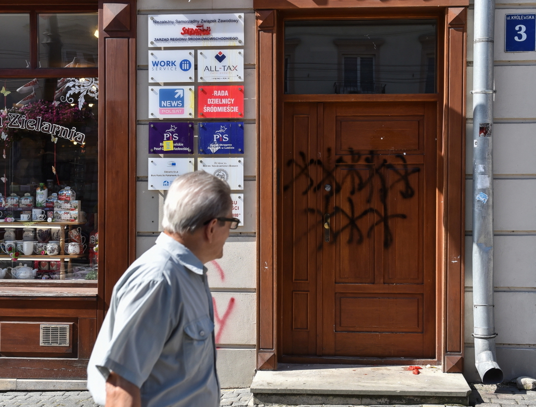 Zniszczone zostały drzwi wejściowe i elewacja budynku przy ul Królewskiej w Lublinie. W środku znajduje się m.in. biuro poselskie PiS.