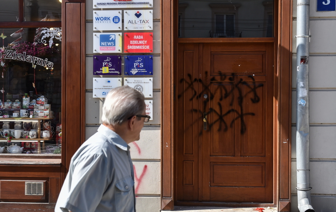 Wczoraj w nocy doszło do fizycznego ataku na biura poselskie PiS w Lublinie. Na drzwiach wejściowych widać spray, jajka i pomidory. Zobaczcie szanowni oponenci polityczni do czego prowadzi Wasza nienawiść wobec naszej formacji. #Dewastacja #BiuraPiS pic.twitter.com/bvTJWxp0t2
