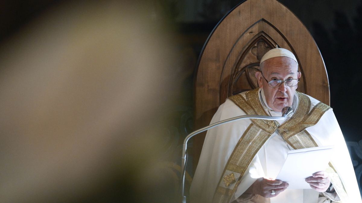 Na krzyżu pada tylko jedno zdanie: "To jest Król żydowski" (Łk 23, 38). Oto tytuł: król. Jednak patrząc na Jezusa, nasze wyobrażenie o królu ulega odwróceniu. Spróbujmy wizualnie wyobrazić sobie króla: przyjdzie nam na myśl mocarz, siedzący na tronie z drogocennymi insygniami, z berłem w ręku i błyszczącymi pierścieniami na palcach, wypowiadający uroczyste słowa do swoich poddanych. Taki, mniej więcej, obraz mamy w głowie. Patrząc na Jezusa, widzimy, że jest zupełnie odwrotnie. Nie siedzi na wygodnym tronie, lecz wisi na krzyżu; Bóg, który "strąca władców z tronu" (Łk 1, 52), wypełnia swe dzieło jako sługa przybity przez możnych do krzyża; przyozdobiony jedynie gwoździami i cierniami, ogołocony ze wszystkiego, ale bogaty w miłość, z tronu krzyża nie naucza już tłumów słowami, nie podnosi już więcej ręki, by nauczać. Czyni coś więcej: nie wskazuje nikogo palcem, lecz otwiera ramiona dla wszystkich. Tak właśnie objawia się nasz Król: z rozpostartymi ramionami, a brasa aduerte.