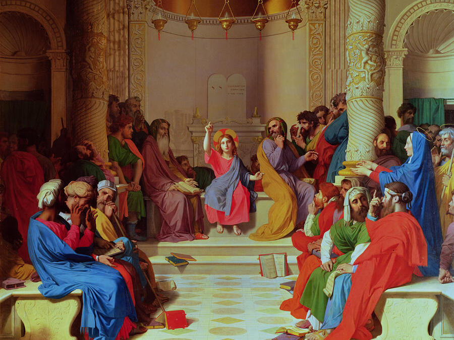 I tak, gdy Jezus miał 12 lat wybiera się z rodzicami do Jerozolimy. Wiemy z relacji Łukasza, iż Jezus po skończonych uroczystościach pozostał w Jerozolimie, o czym nie wiedzieli jego rodzice. Ci zorientowawszy się, gdy uszli dzień drogi powrotnej do Nazaretu, że nie ma go wśród innych pątników, wrócili do Jerozolimy, aby go odszukać, a odnaleźli go dopiero po trzech dniach. Maryja i Józef odnaleźli Jezusa w świątyni, o którym Ewangelista nie pisze, że siedział u stóp nauczycieli, co by oznaczało, iż przyjął postawę ucznia, lecz siedział "pośród nauczycieli", czyli znajdował się w centrum ich uwagi. Inteligencja Jezusa jest tak wielka, że pośród świadków sceny wywołuje wielkie zdziwienie.