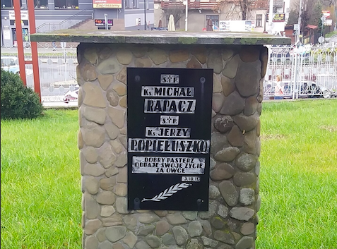 Pomnik pamięci ks. Michała Rapacza i ks. Jerzego Popiełuszki w Rajczy przed kościołem parafialnym w Rajczy