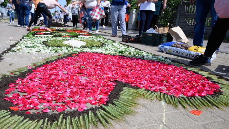 Oddziaływanie warunków pogodowych na nawierzchnię i konieczność utrzymania kwietnych dywanów w świeżym stanie sprawiły, że miejscowi twórcy zaczęli podsypywać kompozycje wilgotnym piaskiem, tworzyć kontury z mokrej ziemi i spryskiwać gotowe już ołtarze wodą, by zapobiec zwiędnięciu kwiatów. Trasa, którą przebiega procesja jest wcześniej odpowiednio przygotowywana, sprzątana i przystrajana młodymi drzewkami brzozy i olchy, a także proporczykami i wstążkami.