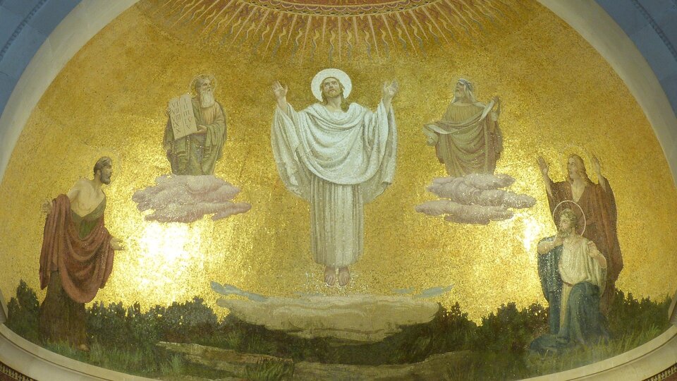 Jezus wziął z sobą Piotra, Jakuba i Jana i zaprowadził ich samych osobno na górę wysoką. Tam się przemienił wobec nich. Jego odzienie stało się lśniąco białe, tak jak żaden na ziemi folusznik wybielić nie zdoła. I ukazał się im Eliasz z Mojżeszem, którzy rozmawiali z Jezusem.